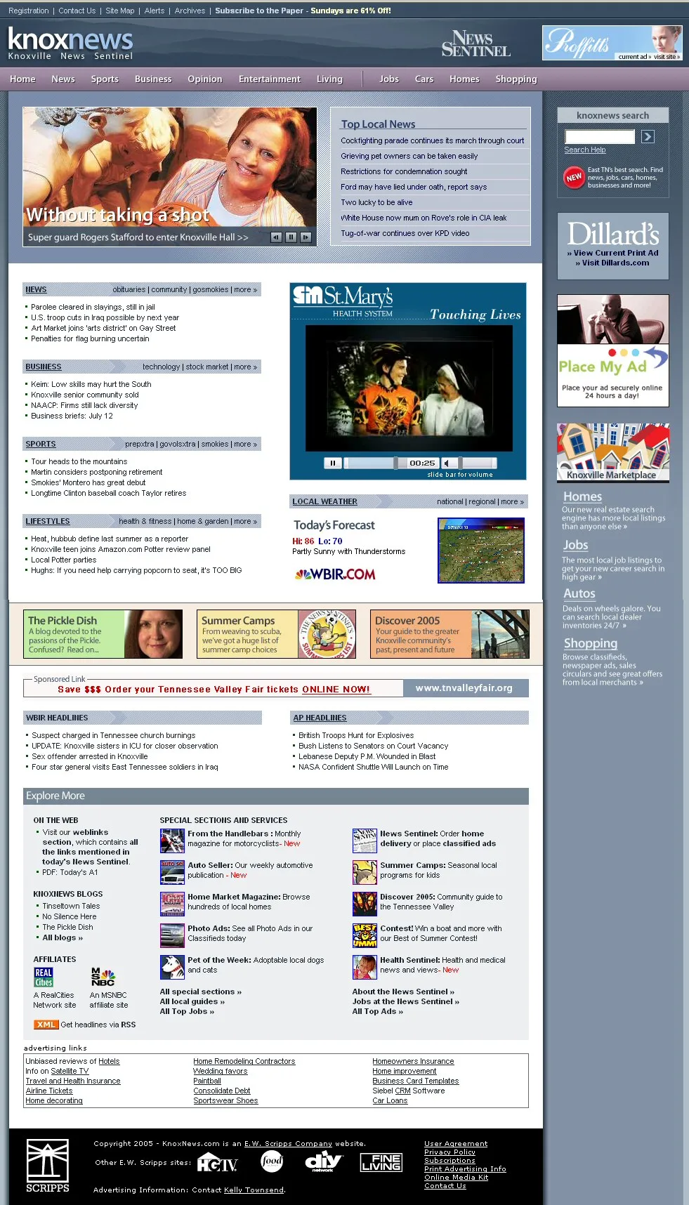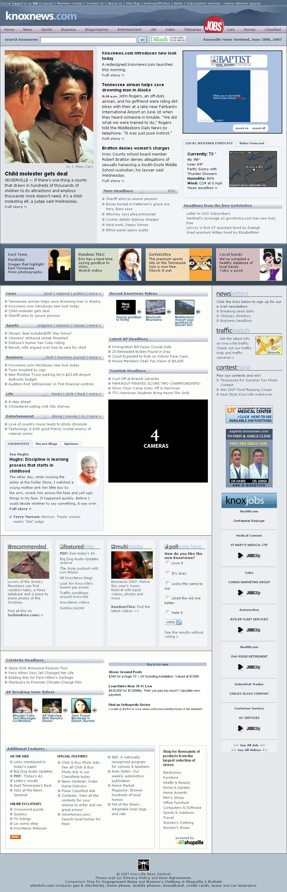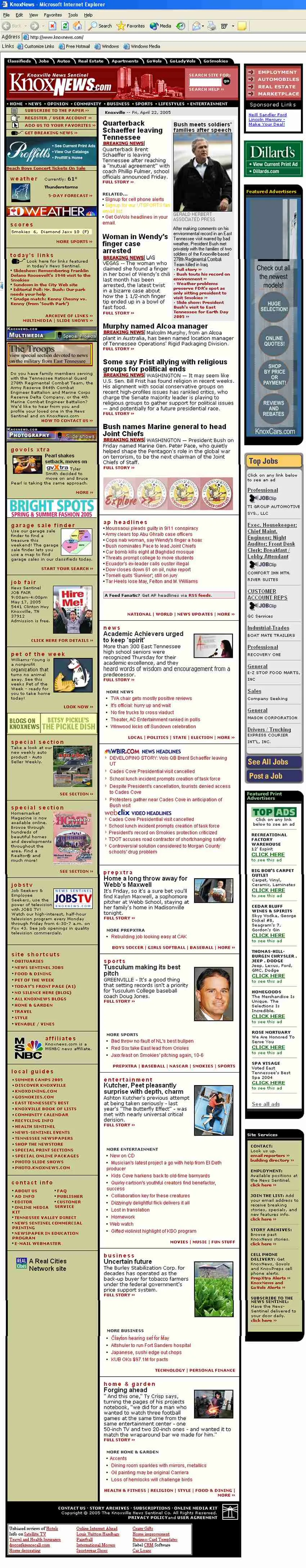 We’ve launched a new knoxnews.com today. I thought some folks might like to see the last three designs of knoxnews (sorry, not sure if I have one from further back, unfortunately). The first was used for three or four years and was “retired” in April 2005. We thought it was very tired by then. The second one is the original successor look, but I noticed in looking at the home page yesterday, we had made more “adjustmenets” by the end of its run than I had thought. The one on the right is an early morning shot of the new, current design. You can click on each image to get a larger view. Update: Jay Small explains many of thenuances.