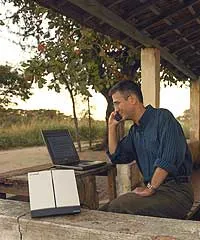 The backpack is a camera, a G4 Apple laptop and a satellite modem. Firewire the camera to the laptop, connect the laptop to the modem, fire up the software and, BAM, you’re on the “internet in the sky,” Ferguson said.