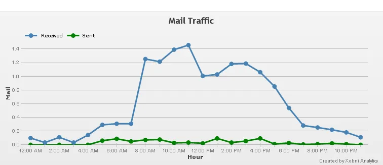 The chart above (click on it to get a larger version) shows part of the picture, or problem. It’s a graph showing average email by hour to my desktop Outlook program. Problem is I also read, reply and delete a lot of mail in the Web-based version of Outlook. And then there’s Gmail (a couple accounts), Yahoo email, and, oh yes, Hotmail.
