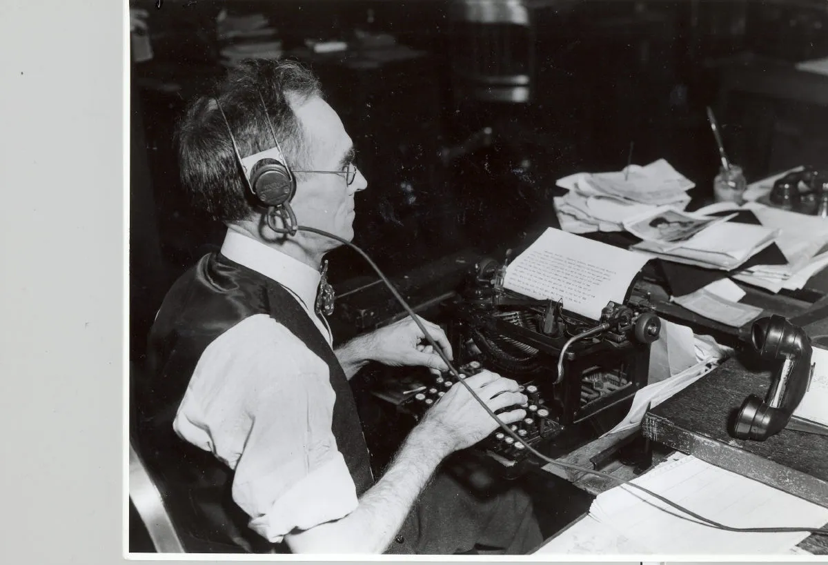 Photo: Taken circa 1939: Greensboro, N.C., City Editor Granberry Dixon taking a story over the phone. At the far right is a glue pot and the proverbial spike. (Greensboro News-Record photo)