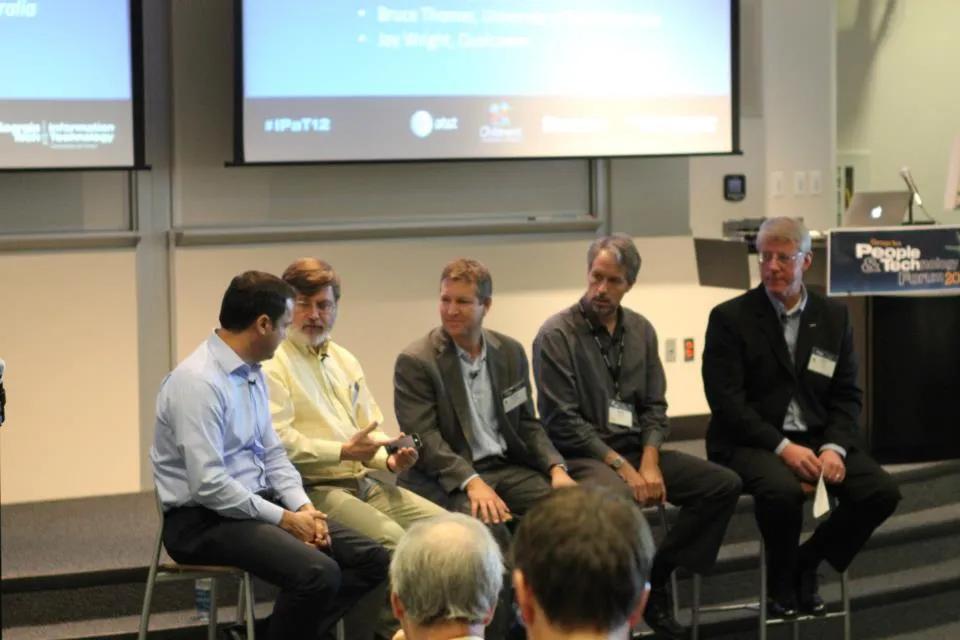 Photo: “Mobile Device & Beyond” panel- Bruce Thomas, Director, Wearable Computer Lab University of South Australia & Jay Wright, Vice President, Business Development at Qualcomm discuss future of mobile devices & wearable computing – at Georgia Tech Global Learning Center. (Georgia Tech Photo)