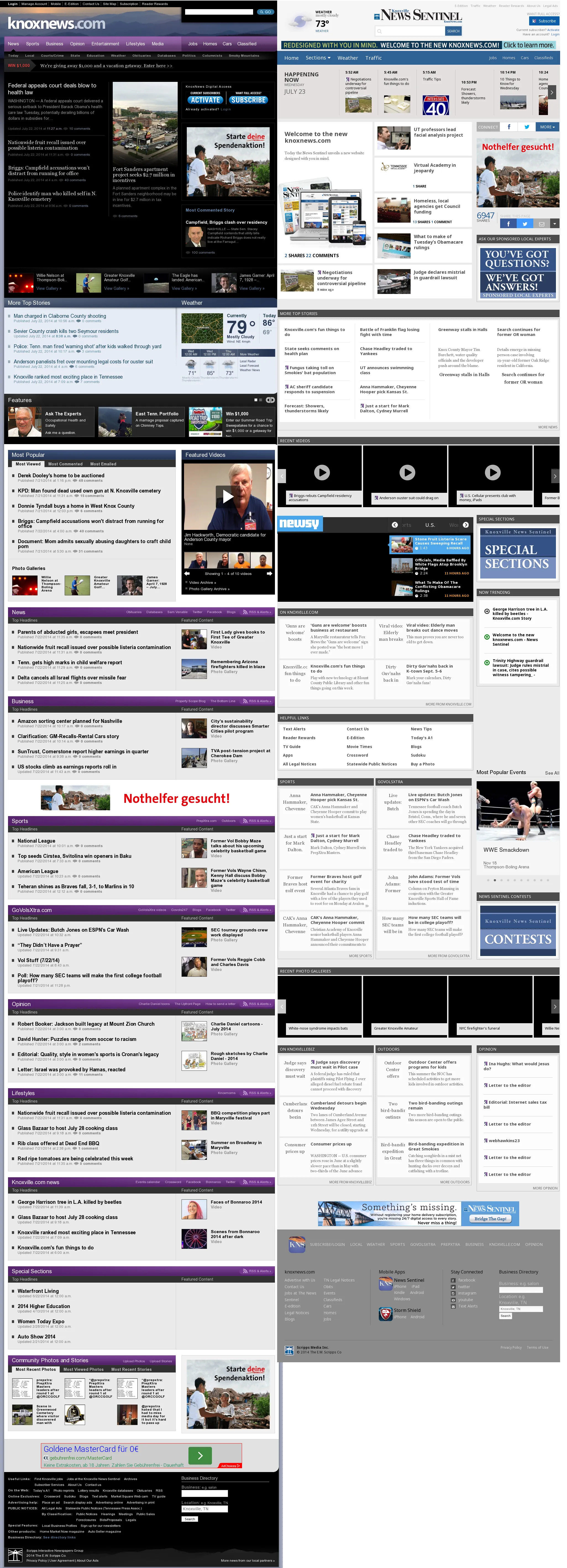 The old knoxnews (a design in use for just over seven years) and the new design, launched July 22, 2014. The old site was on the “Ellington” platform; the new one uses “Endplay.” What’s up with the German ads? We use a screenshot service whose ip addresses are in Germany.