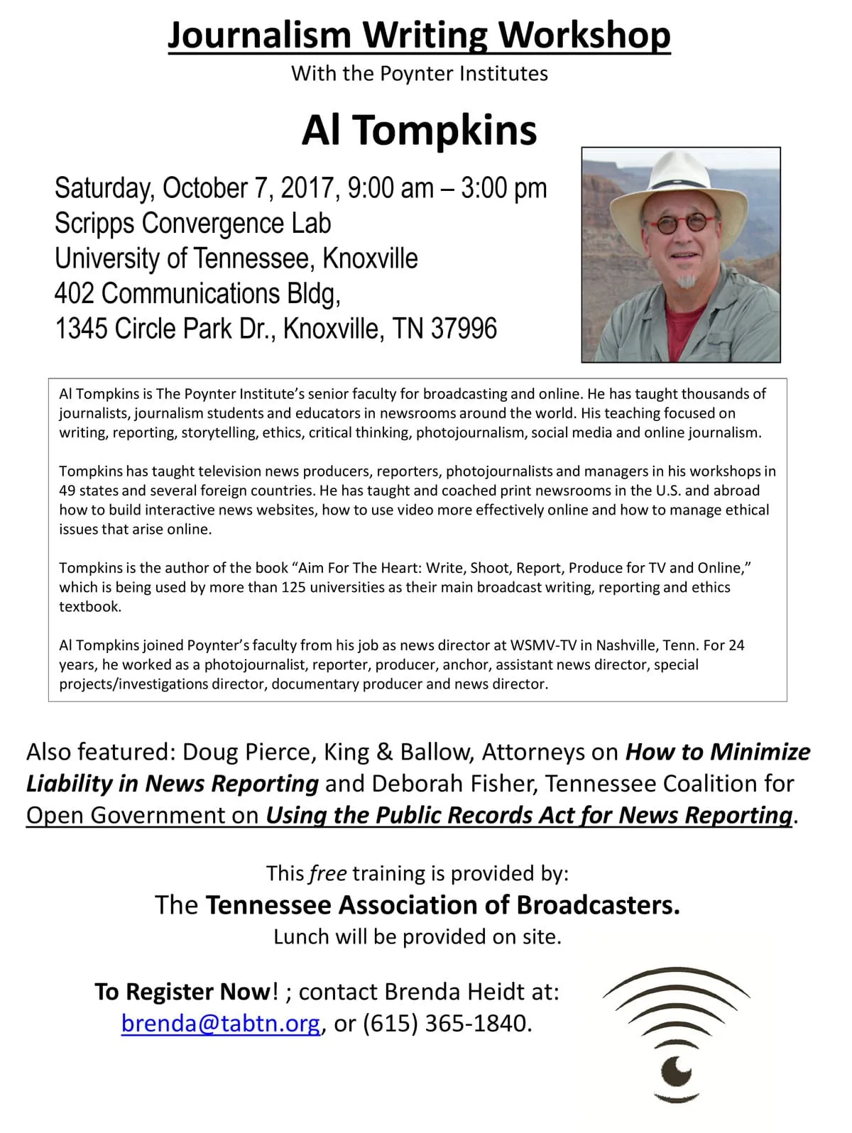 Journalism Writing Workshop with Al Tompkins of the Poynter Institute on Saturday, October 7, 2017, 9:00 a.m. – 3:00 p.m., Scripps Convergence Lab, University of Tennessee, Knoxville. To register, contact contact Brenda Heidt at brenda@tabtn.org, or (615) 365-1840.[/caption]