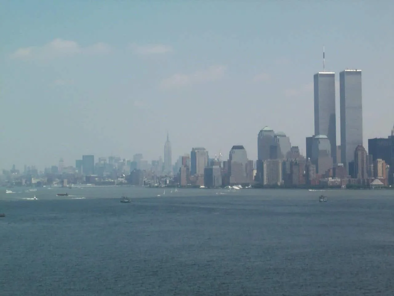 View of the twin towers in 2001 from Liberty Island, home of the Statue of Liberty National Monument.