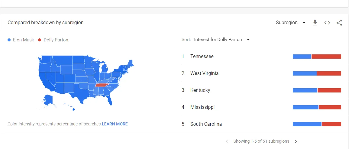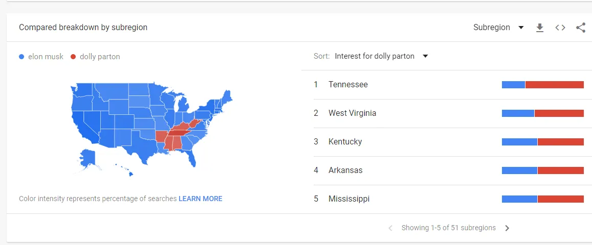 Even the richest man in the world can’t top Dolly Parton for interest in Tennessee as measured by Google Trends.