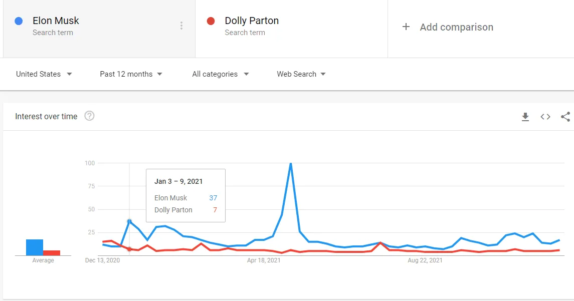 Here’s a how Elon Musk vs Dolly Parton stacks up in the United States in Google search interest over the last 12 months. Musk obviously has had more interest.