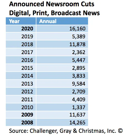 Newsroom job losses 2008 to 2020 (Challenger Gray & Christmas)