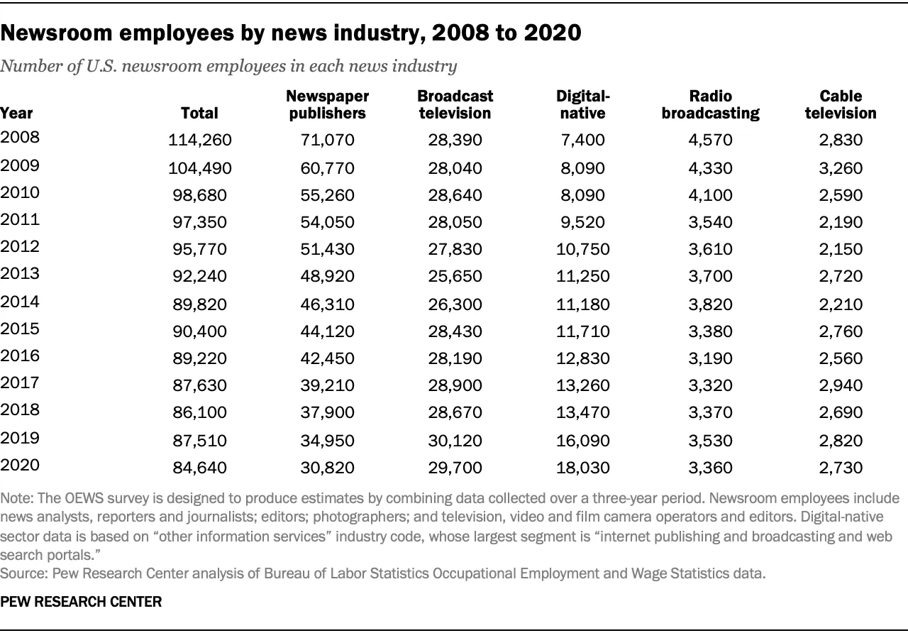 Poynter has been maintaining a list of jobs losses during the pandemic. The Pew Research Center said earlier this year the nunmber of newsroom jobs have fallen 26% since 2008 with big declines in newspaper newsrooms and big increases (but not as big as the newspaper declines) in digital-native newsrooms.